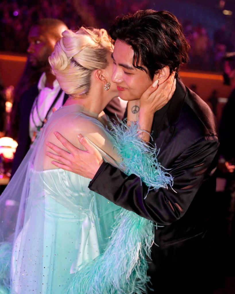 Momen pertemuan tersebut langsung tersebar di media sosial. Dalam tangkapan kamera tersebut, terlihat Lady Gaga dan V saling berpelukan serta menempelkan pipi satu sama lain.